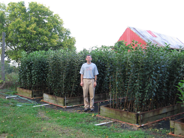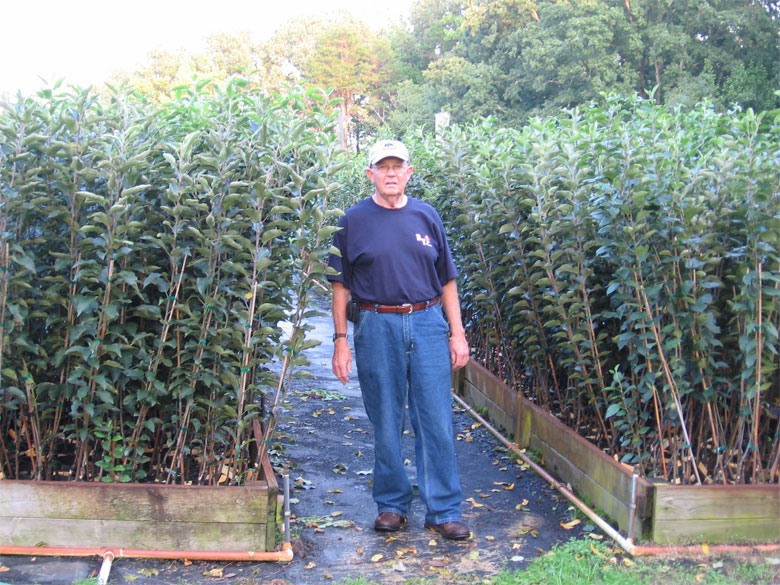 David stands in front of one year old potted trees. These trees have been pruned several inches to prevent wind damage. (above)