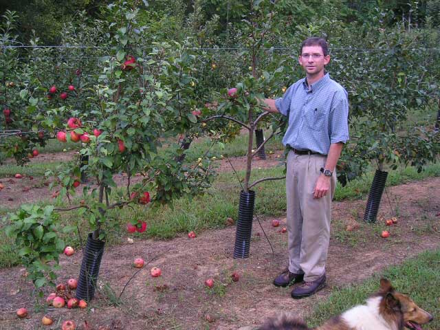 A Clarke's Pearmain on a trellis in full bloom.........................................David strolls through the trellis in mid April.